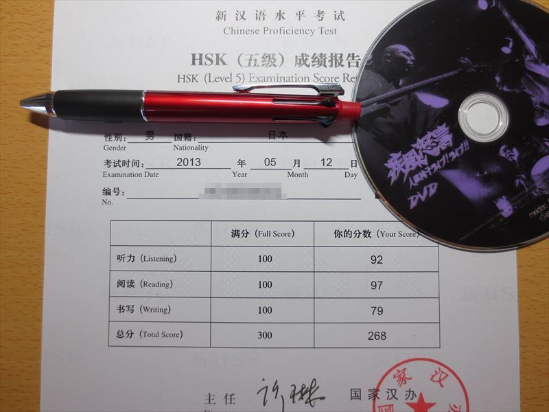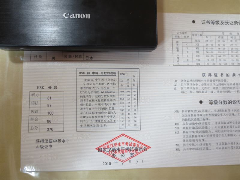 試験遍歴 中国語 2013年11月28日 中検も受けたことですし、過去の試験の結果をさらしときましょう。 TECC 2005年12月11日 総合491 リスニング 256 リーディング235 今は段ちゃんが宣伝してますね。安くしてコンスタントにやればいいのにと思います。 知り合いが今年受けると言ってました。 しかし、よくこの認定証残ってたな。 そして2006年に中国へ。 HSK 2009年4月19日 聴力 語法 閲読 総合 合計 7級 80 80 94 89 345 聴力と語法が7級だったので涙を飲む結果となりました。 HSKといえば「8級でしょ」みたいな時代でした。 職場が日本語環境だったので、意識しないと上達はないです。←言い訳 行っただけでペラペラになる人は尊敬します。 この時は成績証明書はもらいには行ってないです。7級(゚⊿゚)イラネ 2010年6月20日 聴力 語法 閲読 総合 合計 8級 81 97 100 86 370 念願の8級取得です。聴力が7級だったのが悔しかったのを覚えてます。 この時は1ヶ月くらい文法の問題ばかりやってました。結果には反映されてます。 住んでるだけでは、進歩がないのがよくわかります。 次は高等。と思ったら消えてたのは周知の事実。 (本家の北京語言大学ではまだやってるかも) 新HSK 諸事情から5級を受けることに。 問題集をやった限り、さすがに簡単だったので、 「満点狙います」とほうぼうで吹聴してました。 2013年5月12日 聴力 閲読 本写 合計 92 97 79 268 すみません。まだまだでした。 そして、今年の中検に至る。