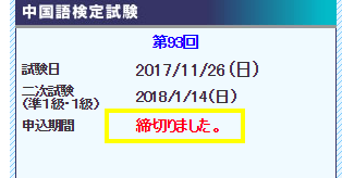 またやってしまった。 中検 2017年10月20日 もうね、笑うしかないですね。 覚悟を決めて、中検サイトを開いたら… アレ…早くないかい。 なんと14:00締め切りでした。 ▼ 17:00までと勘違いしてましたw さっさと申し込んでおくのが正解。 合格する自信がなくても、上のレベルに 挑戦しないと伸びないような気もするしね。 これで、当分は中国語の勉強をしなくなりますw レポートに集中しましょう。 ▼ 台風が来てますね。 投票所は近いので問題ないのですが、 せっかくのハロウィンイベントが… ライコウもまだなのに(笑) 秋の長雨とはよく言ったものですね。 おかげで太りつつありますよ。 体調も芳しくないんですけど…
