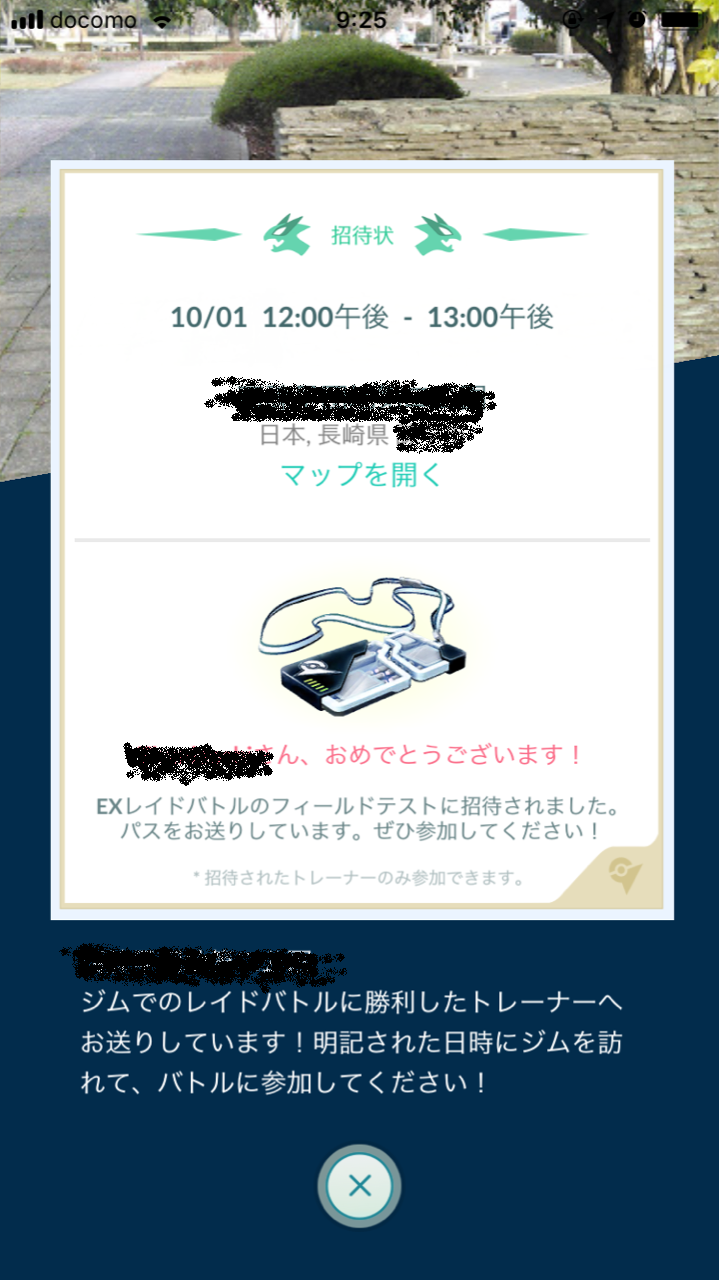 なんとEX レイドの招待状が! ポケ活 2017年09月27日 インド人じゃなくてもびっくり。 先週、駄目元で長崎市内のスポンサー 回ったのに、まさかの近所当選です。 第五回に関して、現時点では やや外れた場所が多いようですね。 (該当地区の方すみません) ▼ ここのレイドに参加した記憶すら あやふやだったのですが… それくらいレイドやってない場所。 金曜に某アプリから救援依頼がきて バンギレイドに参加してました。 この時は自分を含め6名でした。 当日は果たして人数が集まるのでしょうか(笑