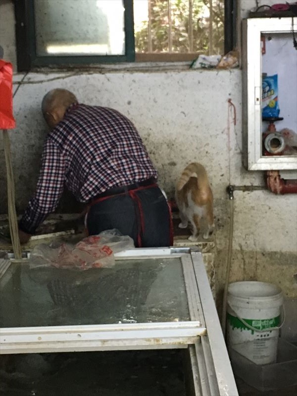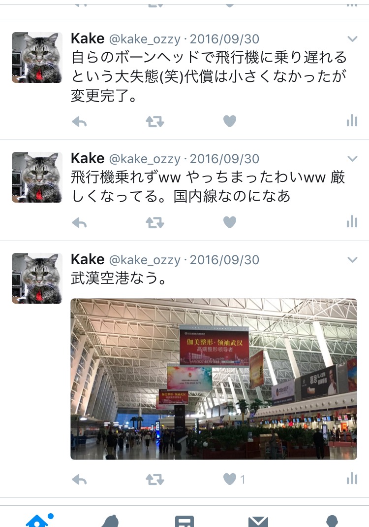 四川省へ ~その1~ 旅 2016年10月12日 9月30日 朝早くからタクシーで空港へ。 早めに着いたので、まずはKFCで朝食。 そしてフライトの1時間ほど前にカウンターへ。 我々の前に旅慣れてなさそうな二人組がいて、 何やらすったもんだして時間がかかってます。 そして我々の番。 私たち「成都まで」 服務員「時間過ぎてます」 私「!?」 服「5分過ぎてる。遅れた人用のカウンターへ」 よく見ると「40分前に手続きして」と カウンターに書いてありました。 国内線って30分じゃなかったけ。 慌ててそのカウンターへ。 交渉は友達に任せますw 案の定、融通が利くはずもなくあえなく糸冬。 (この日の成都行きの便は空席なしでした) 列車のほうも空席はなし。安 立ち席はあったけど8時間はしんどいですね。 打つ手無しということで、一旦帰宅することに。 ▼ 次善の策をと、旅行会社と交渉(友達がw) なんとかツアーの日程を変更してもらいます。 飛行機はキャンセルして、自分らで予約しろと。 国慶節期間中はさすがに飛行機代、高騰してます。 さて、日程の変更を余儀なくされたので、自分は 武漢へ寄らず直接上海へ行くことになりました。 成都ー上海の便へ変更。1800元だそうです。 長崎ー上海の往復と同じやん(ノД`)シクシク 往路の成都行きの便も夜中に到着するものに変更。 おかげで初日の成都観光は断念です。(T_T) その時のボヤキツイートがこちらになります。 教訓:早め早めに行動しましょう。 ▼ 帰宅後、昼ごはんの野菜を買いにいった店。 おっさんのさばく魚を狙う猫。